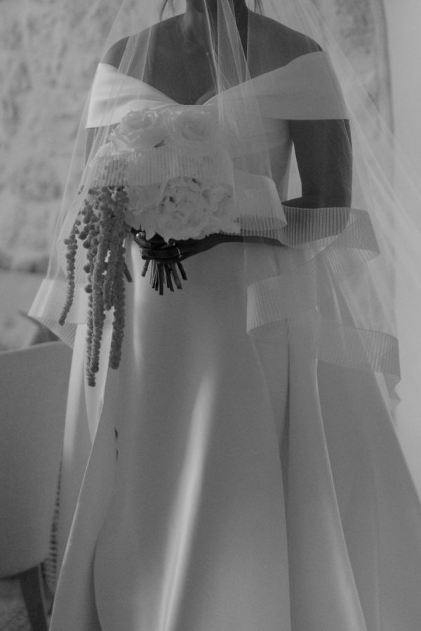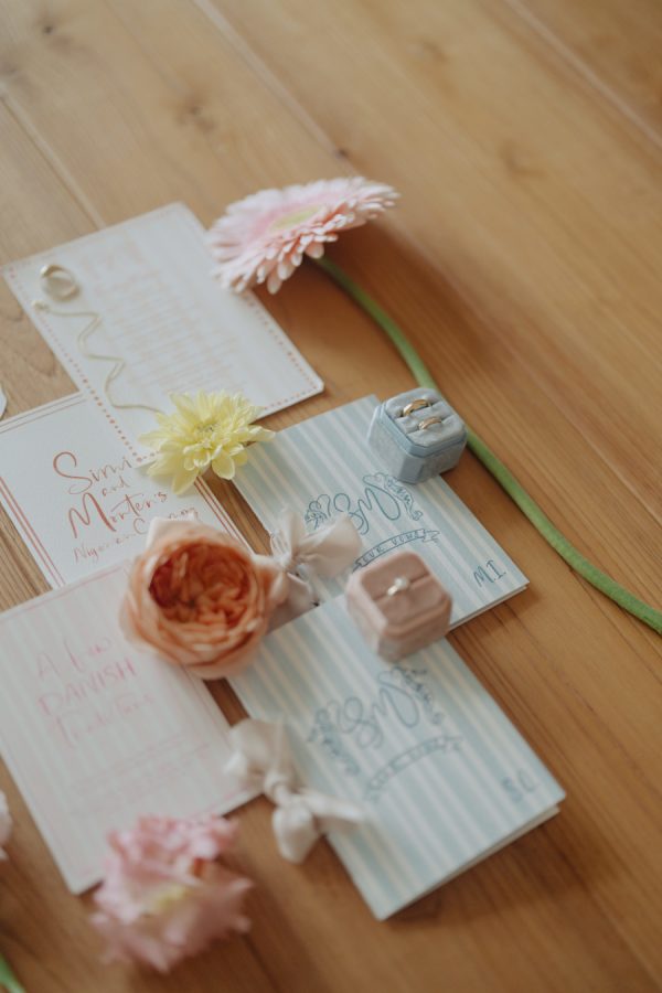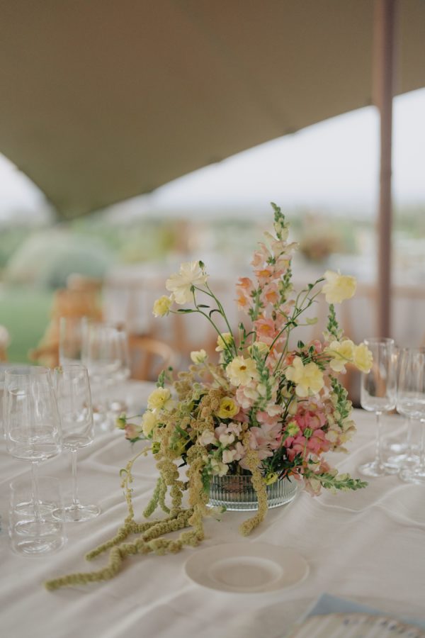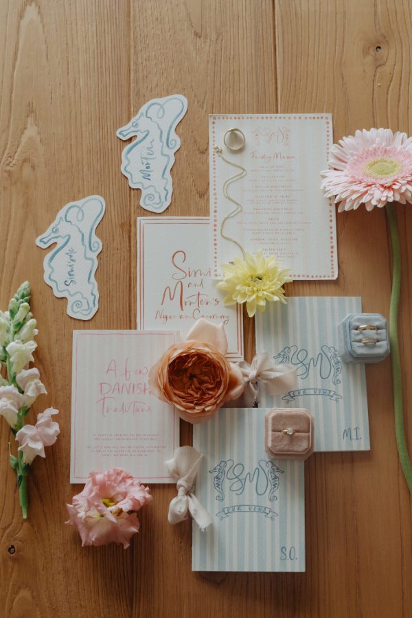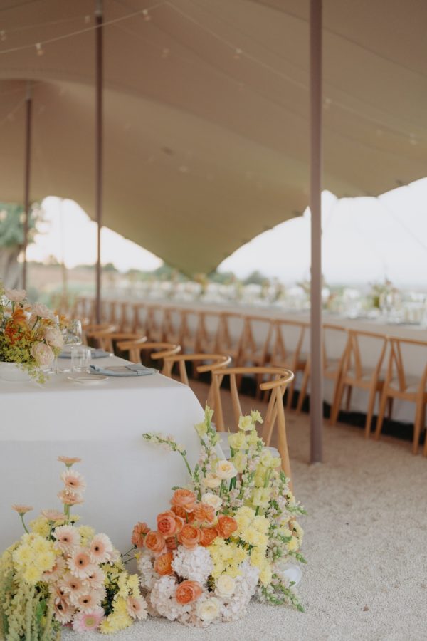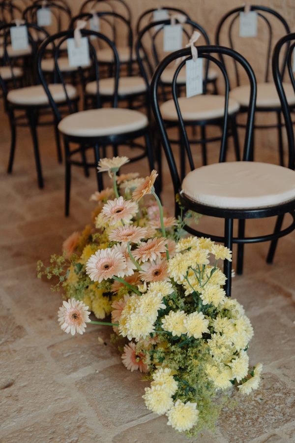 Florals were soft, romantic, and intentionally understated, allowing the historic surroundings to shine. Pastel arrangements added warmth and contrast to the villa’s stone interiors, particularly during the indoor ceremony, where blooms popped beautifully against black Thonet chairs. Outdoor spaces were styled with long tables, wishbone chairs, candlelight, and subtle Danish design elements, creating a refined yet welcoming atmosphere that flowed seamlessly from day to night.