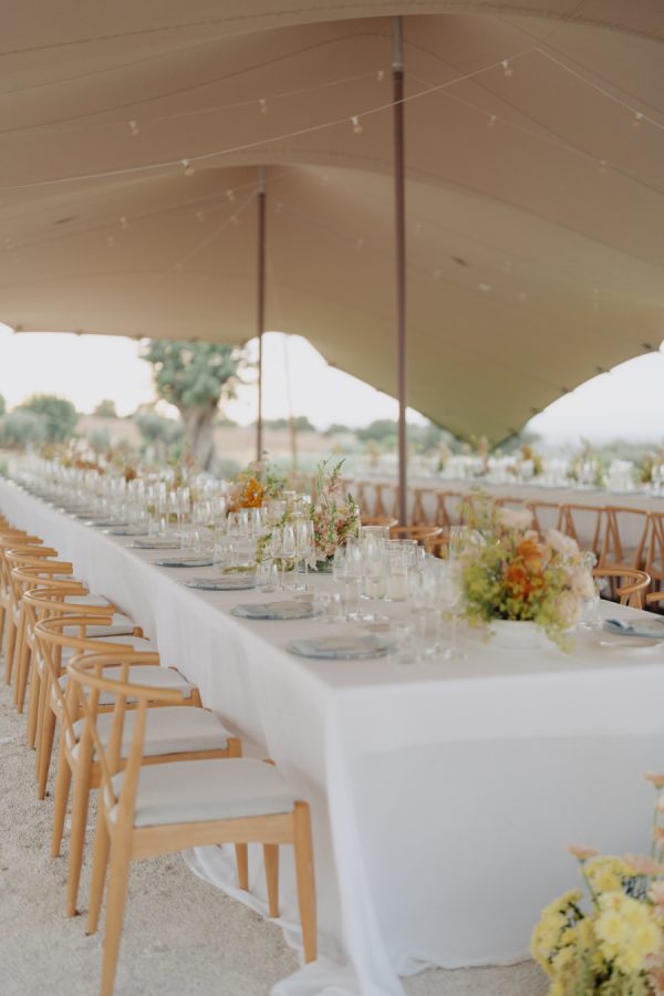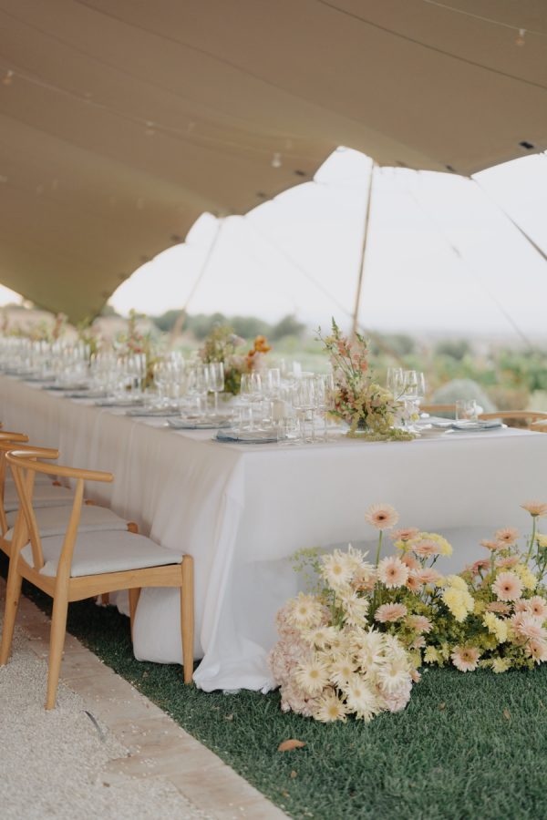 Soft pastels layered with warm Mediterranean neutrals set the tone for the celebration. Blush, pale blue, lavender, and buttery yellow florals were paired with natural stone, olive green and candlelight, allowing the colours to feel romantic yet grounded in the Puglian landscape.
