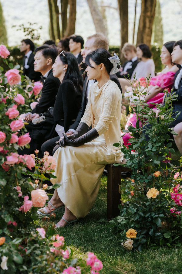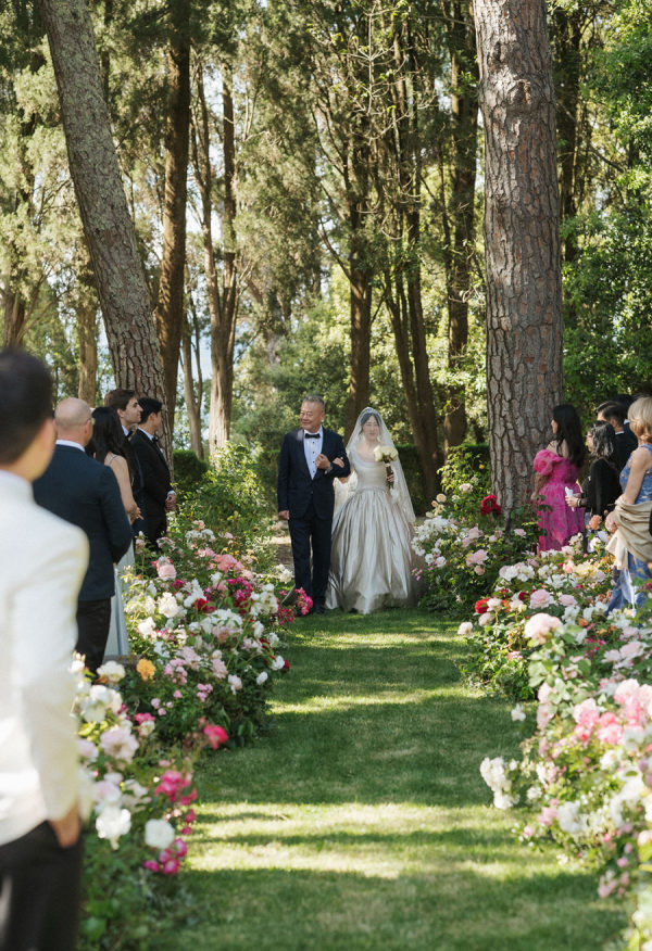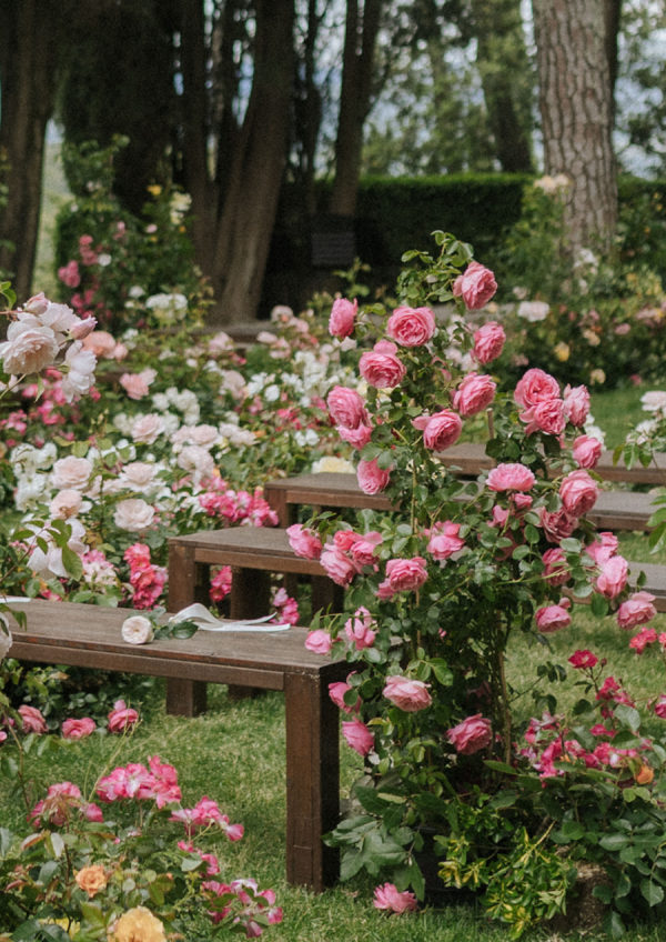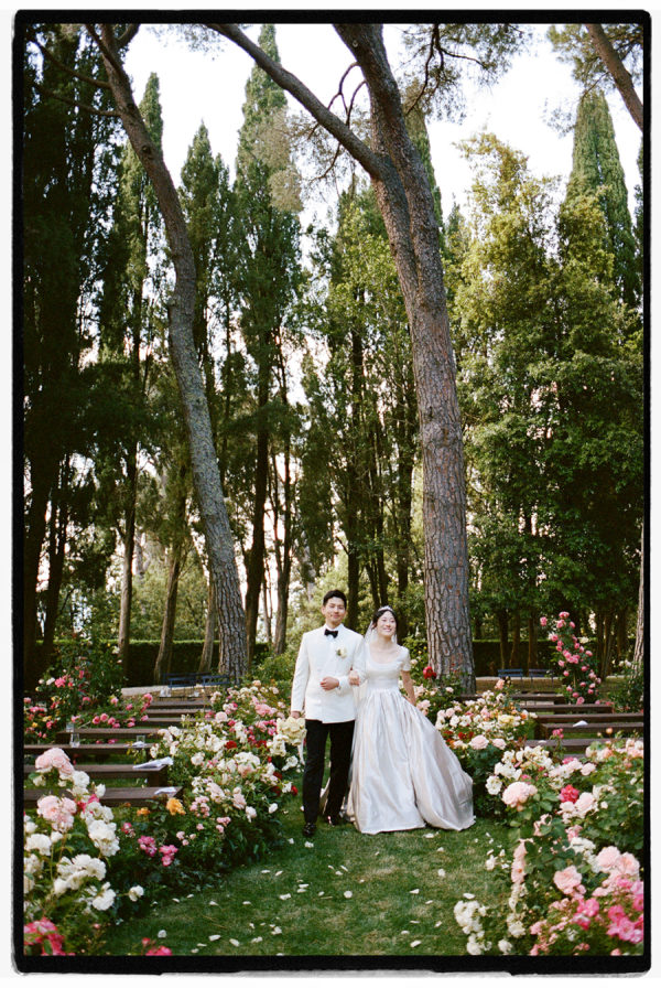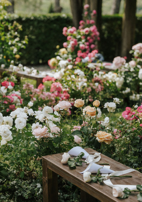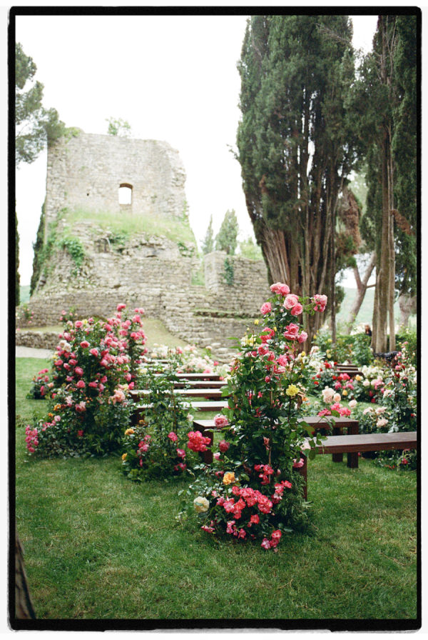 A fairy tale among abandoned ruins.s We envision creating a romantic and timeless rose garden: a space crafted with various rose plants arranged to appear as if they have grown naturally amidst lush greenery. The ruins of the castle, serving as a backdrop for the ceremony, will add a theatrical and impactful touch. Irregularly placed seating will invite guests to ‘find their seat among the roses,’ fostering a sense of intimacy and enchantment. From the bride: “After years oflong-distance livinge across Shanghai, London, and New York, Sarah and James wanted their wedding to feel intimate and joyful—a place where family and friends could stay together and get to know each other. Inspired by the medieval castle ruins on the grounds of their Tuscan venue, they transformed the space into a hidden garden for the ceremony. Vivid red and pink roses emerged from the ground as the main floral installation, contrasting with the surrounding cypress trees and rolling hills. Guests sat on benches woven throughout the flowers, creating an intimate, immersive experience. Dinner tables overflowed with flowers, fruit, and texture, blending the ancient with the unexpected. The celebration lasted late into the night, ending with a spontaneous swim to cap the day.”