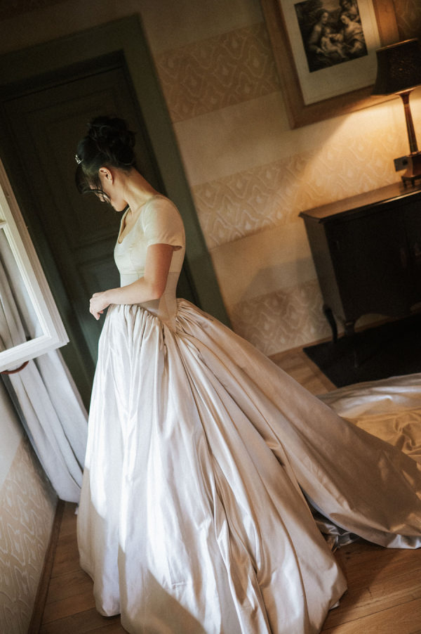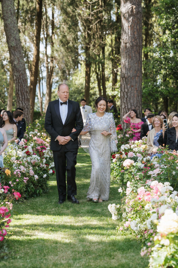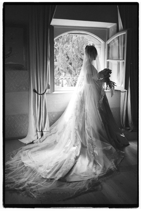 The bride’s gown was a deeply personal creation that reflected her sentimental yet modern style. It’s a unique piece of Monvieve. Sarah had her heart set on a cathedral-length veil edged in silver lace, which became the inspiration for her gown. She sourced the bodice, with a pearl-embroidered scoop neck and cap sleeves, from a vintage dress, and paired it with a custom-made dropped-waist skirt in oyster satin. For the first dance, she changed into a 1950s-inspired off-the-shoulder, dotted-tulle tea-length dress to a mashup of Sinatra’s Strangers in the Night and Volare. Classic Manolo heels, a family-gifted tiara, and earrings borrowed from her mother, worn at her own wedding, completed the look. Here is how she described the process: “I bought a vintage ’90s dress that had a pearl-embroidered scoop neck and cap sleeves. I loved its shape because it reminded me of my mom’s dress from the ’90s and had a touch of a Bridgerton silhouette. The skirt, however, wasn’t ideal, so Alison at Monvieve helped me redesign the waist and skirt. She sourced beautiful silks from Taroni in Como and suggested an oyster-colored satin, which gave the gown a romantic yet modern tone. Together with Nadin Fashion Alterations, we completely remade the skirt and waist over five months of fittings. They even created a matching satin bg, and used lace from my veil and satin from the gown for the ring pillow. The day before I left, they added pockets as a final touch. It was a very special experience.” Wanting to elevate the silhouette while preserving its nostalgic charm, she collaborated with Monvieve to redesign the skirt and waist entirely. Together, they sourced exquisite silks from Taroni in Como, ultimately choosing an oyster-colored satin that gave the dress a refined softness. For the reception, she changed into a reimagined Philippa Lepley gown—originally a ballgown purchased secondhand from Stillwhite. Nadin transformed it into a chic tea-length dress by reconstructing the corseted bodice and shortening the skirt, making it perfect for dancing beneath the Tuscan stars.
