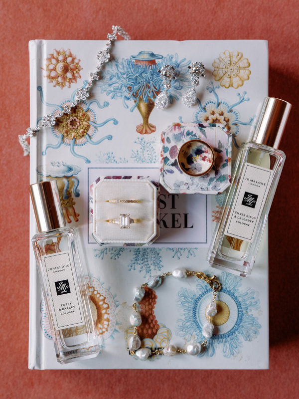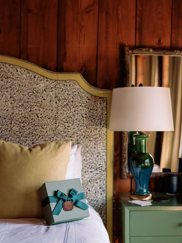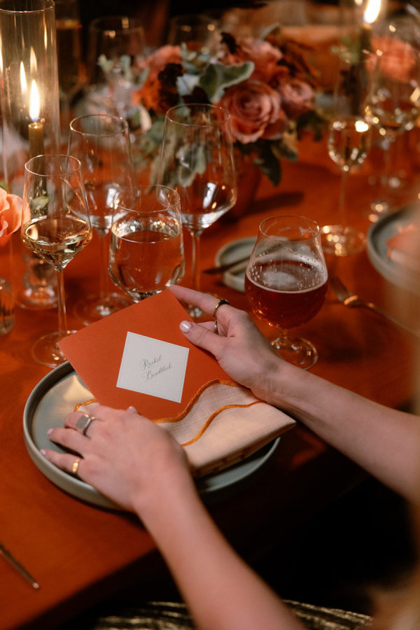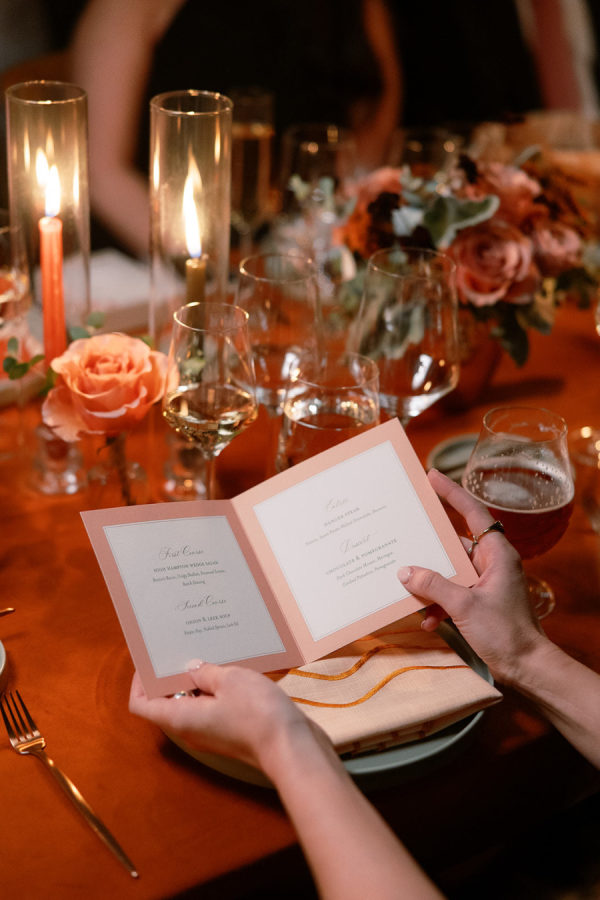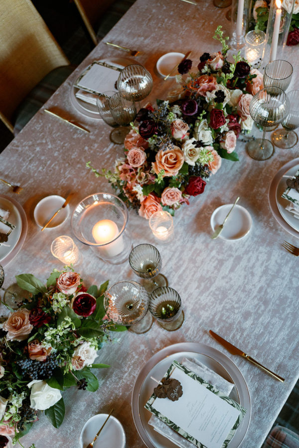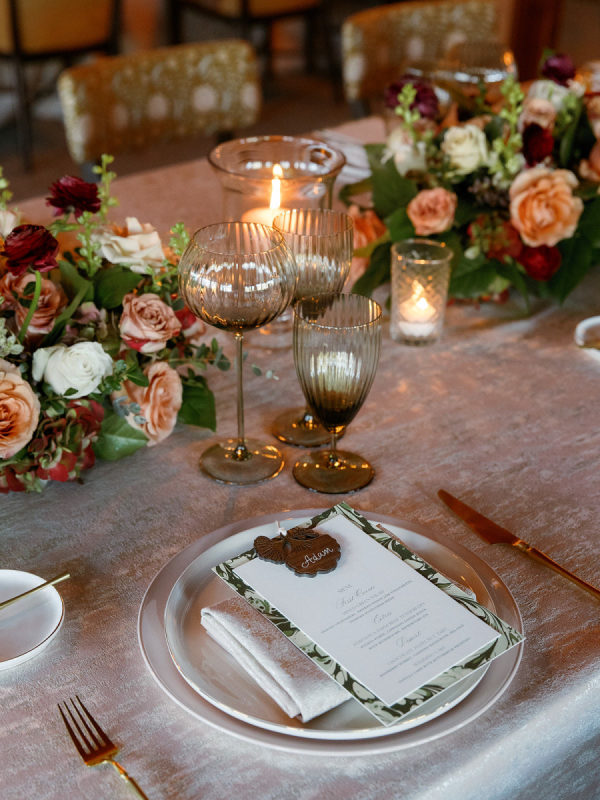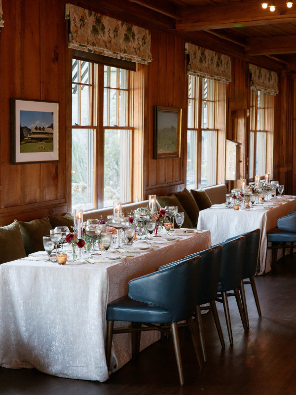Throughout the weekend, we focused on allowing the vibrant color palette to harmonize with High Hampton’s natural surroundings and the property’s signature patterns, prints, and textures. A custom marble pattern, created by local marbling artist Kim Padula, was seamlessly integrated into paper elements and décor in both green and blue color ways. Guests first encountered the green version in a beautifully engraved and embossed invitation suite, presented in a dark green box lined with the marbled artwork. The pattern also appeared on Inn key envelopes at check-in, on the border of the dinner menu cards, and custom boxes, each with a deck of Uno (Katie and James’ favorite card game!) that were featured in the welcome gifts guests received upon arrival for their weekend stay. The blue version of the marble pattern was kept as a visual surprise for guests, revealed only after dinner in the tent on oversized drum shades for hanging light fixtures, stage wallpaper accents, and a custom dance floor, adding a playful yet cohesive layer to the weekend’s design. Flowers played a central role in weaving the full color story throughout the weekend. Key blooms included Moab and Romantic Antike garden roses, ranunculus, terracotta lisianthus, privet berry, chocolate cosmos, magnolia foliage, eucalyptus, hellebores, larkspur, and antique hydrangea, creating arrangements that were lush, layered, and texturally rich. Texture played a key role throughout the weekend, with guests encountering rich velvet fabrics, embroidered linens, and intriguing print and laser-cut details such as wooden ginkgo leaf place cards that were personalized with each guest’s name and affixed to their menu card at dinner. Every dining experience was thoughtfully layered, creating tabletop environments that felt both intentional and elevated throughout the weekend.