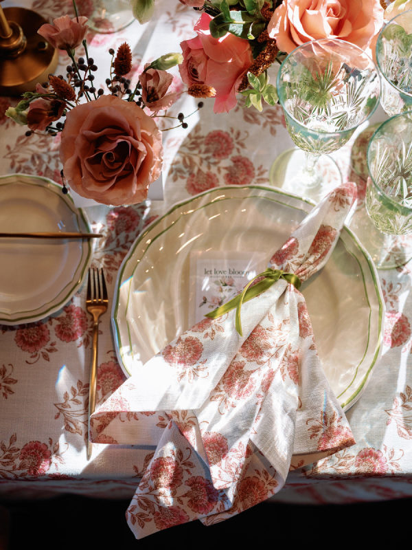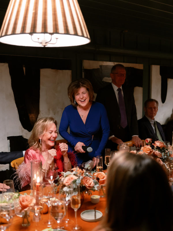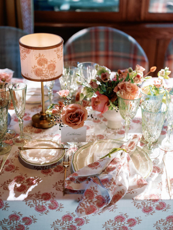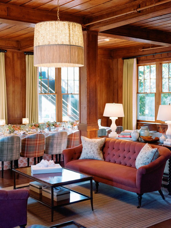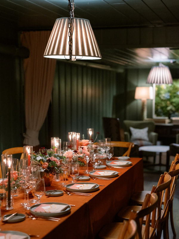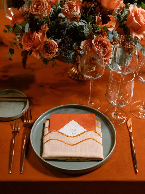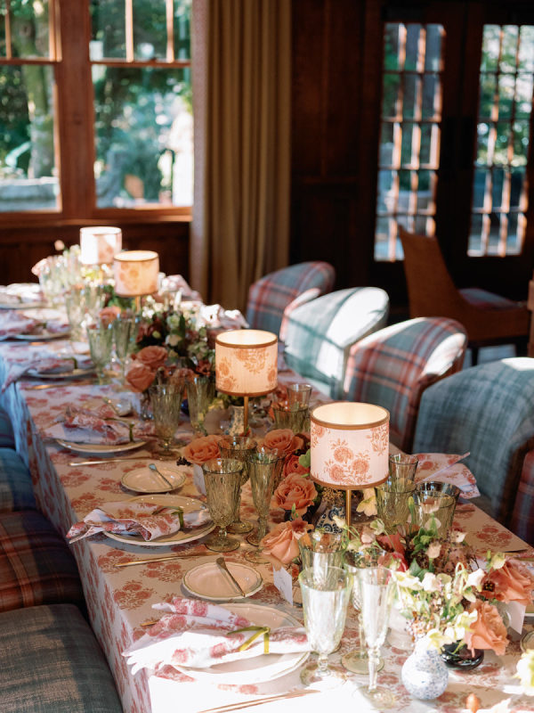 The color palette for the weekend included greens, soft ivory, dusty blue, deep midnight blue, soft peachy blush, terracotta, and rust with rich brown and punchy wine, coral, and cranberry hues. Each event teased out a different portion of the palette. The intimate rehearsal dinner on Thursday night leaned into sage green with copper and terracotta, and snippets of midnight blue and brown. The bridal luncheon on Friday afternoon centered around wine tones, with brighter blush and coral, soft greens, and a fun little pop of chartreuse. For Friday evening’s welcome party, we leaned into a richer palette of browns, rust, and various greens to highlight the existing upholstery and patterned elements in the space. On the wedding day, each and every color was involved in some way, culminating in a dance party in a tent designed in primarily blue hues. Across the weekend, the palette guided a thoughtful, curated progression of color that celebrated the seasonal transition from fall to early winter so beautifully.