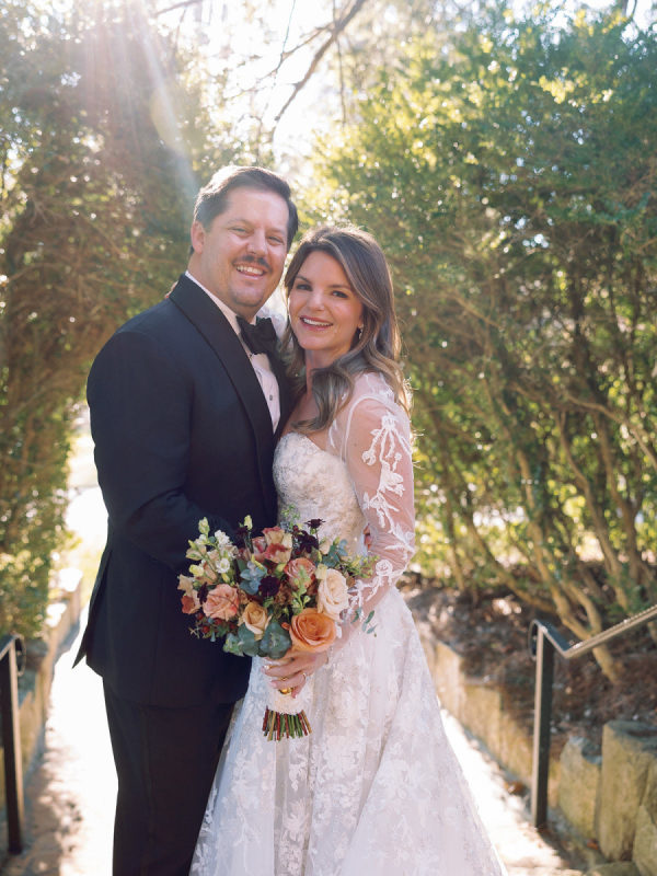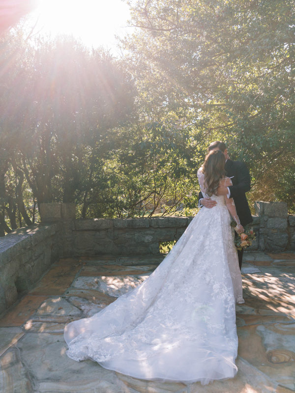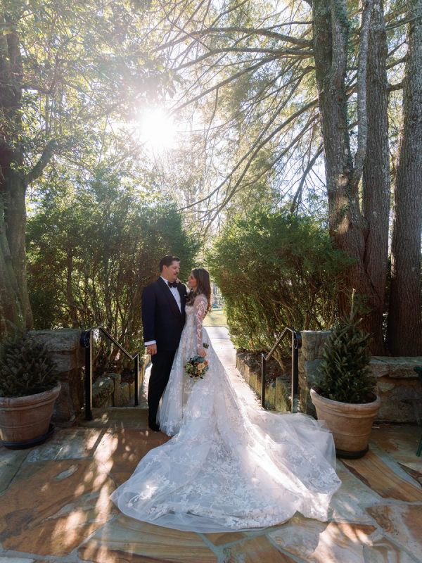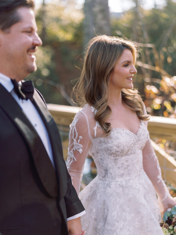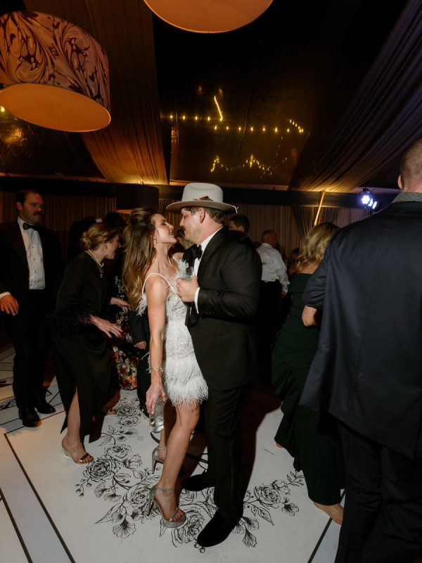 For her walk down the aisle, cocktails, dinner, and first dances, Katie wore Monique Lhuillier’s Lakely gown, which she paired with Bella Belle pumps and heirloom earrings. Later in the evening, she changed into Rachel Gilbert’s feather-tiered “Frenchy” minidress and made an appearance in both Stuart Weitzman silver sandals and ivory lace sneakers by Zimmermann.