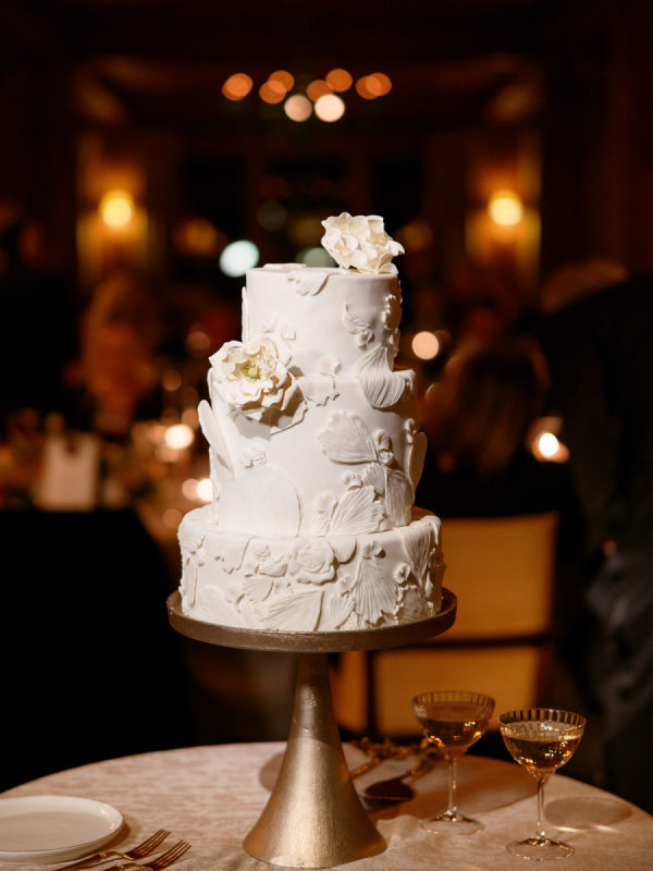 [field title=”Wedding Cake”]High Hampton’s incredible pastry chef, April Franqueza, a 2025 James Beard Awards® Semifinalist, created a stunning three-tier wedding cake that incorporated sculpted sugar gingko leaves and garden roses to mimic the original embossed artwork on their invitation suite. [/field]